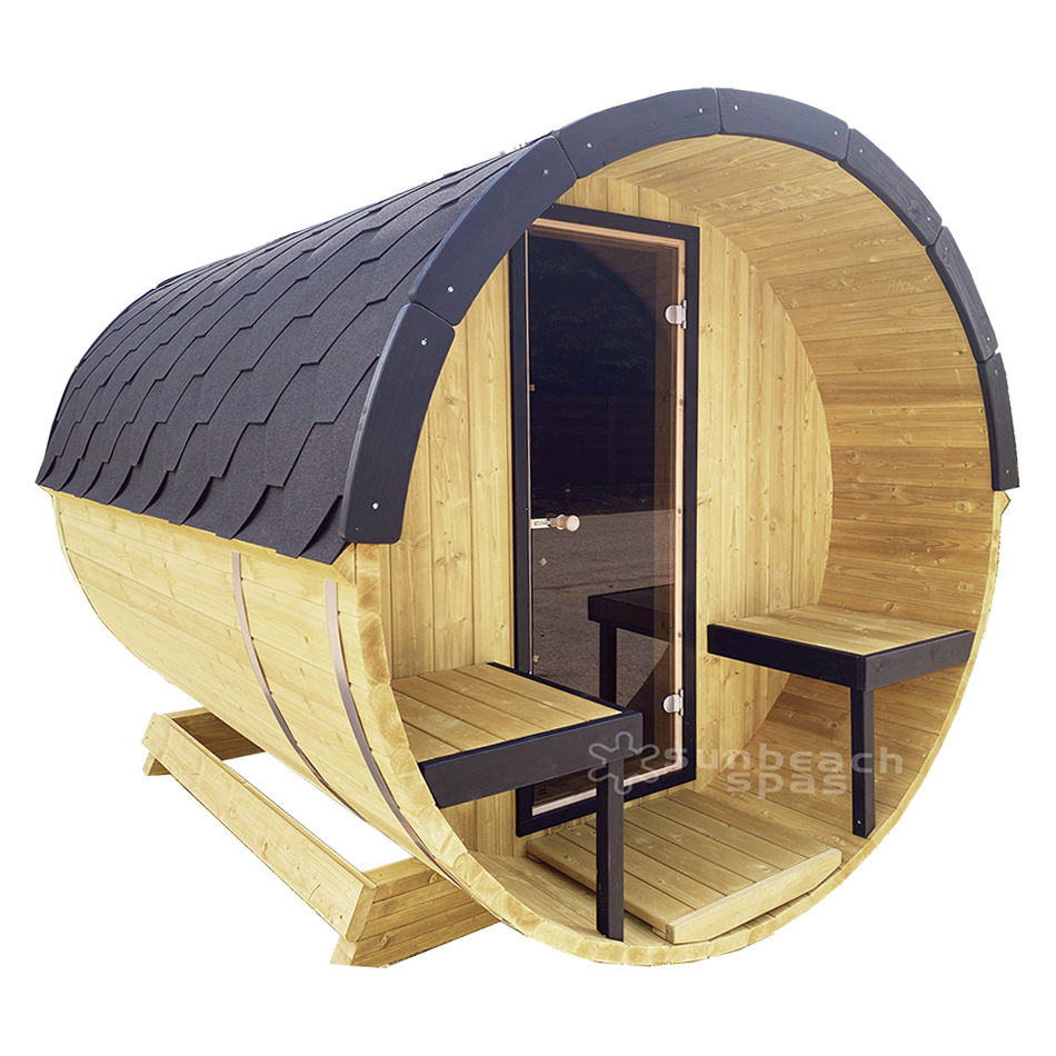 The largest sauna in the Woodchop range, featuring terrace seating area. The interior contains luxurious alder benches, and comfortable room for 6 adults. Add an optional panoramic safety glass rear wall for a stunning view of your garden while bathing. Includes LED interior lighting and Harvia® heater.
